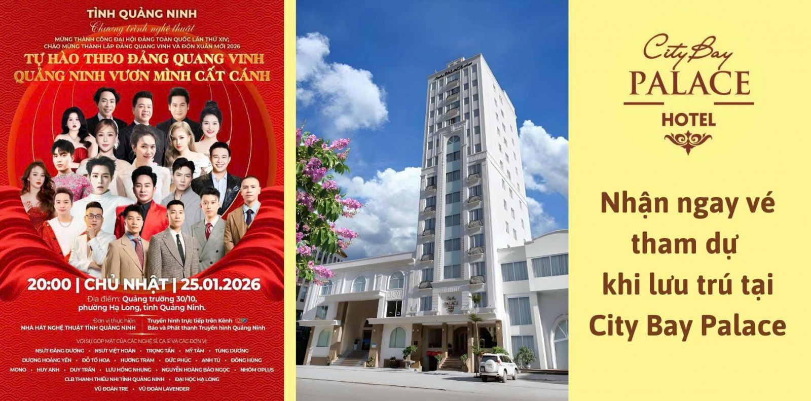 Đặc biệt: City Bay Palace Hotel tiếp tục dành tặng vé tham dự Concert cho Quý khách hàng lưu trú tại khách sạn trong thời gian diễn ra sự kiện.
